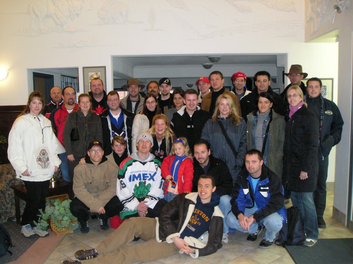 Somit durften sich die nach Calgary ausgewanderten Frösche Jim und Nicola über 28 mehr oder weniger Neu-Kanadier freuen, die sich die nächsten 10 Tage in Ihre Obhut begaben und sehr sehr viele tolle tolle Sachen erleben durften. Vorne weg möchte ich mich als Autor der nachfolgenden Erlebnisse nochmals bei allen 27 Mitreisenden, den beiden Gastgebern Jim und Nicola, sowie allen anderen Leuten, die uns diesen Ausflug ermöglicht haben, sehr sehr herzlich bedanken, weil es auf jeden Fall ein Erlebnis war, das man so schnell nicht vergessen werden wird. Desweiteren glaube ich niemanden vorzugreifen, wenn ich sage, dass es JEDEM sehr gut gefallen hat und er/sie je nach Interessensgebiet das erlebt (und das gekauft) hat, was er/sie erleben wollte!!! So nun zurück zum Wesentlichen und zu den Anfängen der Geschichte... Bei Klick auf die folgenden Tage gelangt Ihr direkt zu den Geschehnissen, die an diesem Tag passiert sind. Von Zeit zu Zeit versuche ich alle 10 Tage dort zu erzählen (was aufgrund der Menge eine Zeit lang dauern kann...). |