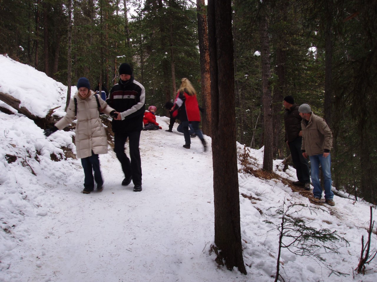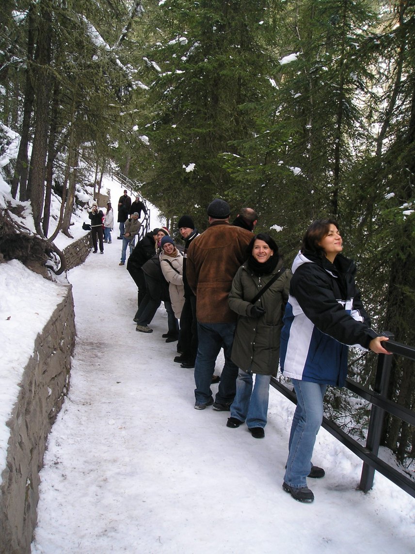 ... auf die arme Gruppe von Wanderern, die sich ab 12.30 Uhr daran machte, den rutschigen Aufstieg (???) zu den Lower Falls und danach zu den Upper Falls zu bewältigen. Da der Untergrund tatsächlich spiegelglatt war, gab es reichlich Gelegenheiten für gewollte und ungewollte Rutschpartien, die zu einer sehr großen Erheiterung bei der Bewältigung des Marsches führten. Interne Sieger der Stolperduelle wurden in den Disziplinen: